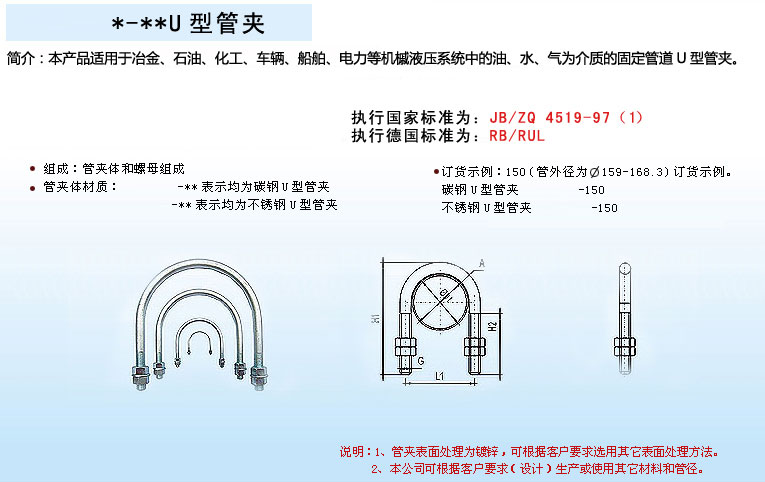 應(yīng)用領(lǐng)域:U型管夾適用于冶金、電力、化工、機(jī)械等行業(yè)的管道固定。