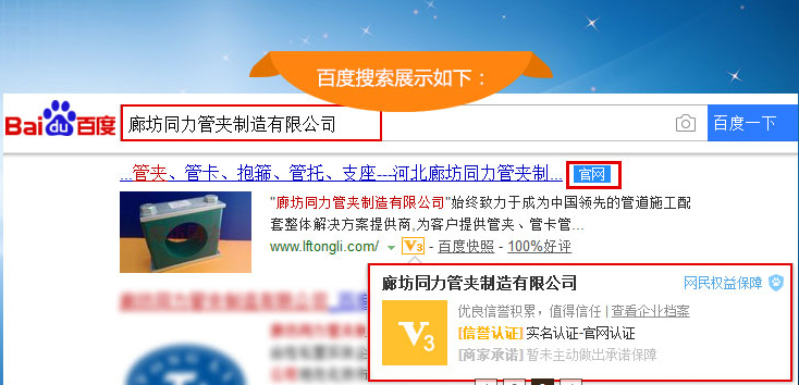當(dāng)前社會互聯(lián)網(wǎng)信息的體量是巨大的。在獲取資訊便捷的同時,虛假信息的泛濫也造成了諸多不便。如何能讓客戶在紛繁復(fù)雜的信息里面找到對的那一個,不會被虛假信息所蒙蔽造成損失,是我們同力管夾公司深切關(guān)注的。通過和百度信譽體系的合作,以百度大數(shù)據(jù)為依托,在2018年8月15日正式上線了百度官方網(wǎng)站認證??蛻粼诎俣人阉鳈谥休斎?ldquo;廊坊同力管夾制造有限公司”,排名靠前的消息且標題尾部掛墜藍色“官網(wǎng)”標識的即為我公司官方網(wǎng)站,網(wǎng)址為“m.tianjichen.com”??蛻粼谶@個網(wǎng)站里面看到的內(nèi)容均為真實有效的,期待您的光臨,特此通知。